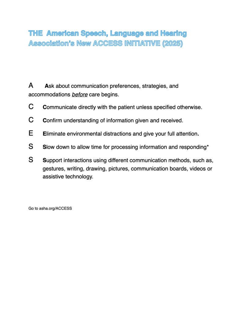 In 2025, The American Speech, Language and Hearing Association, ASHA published guidelines to help medical professionals encountering patients with communication needs.